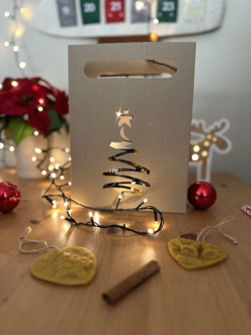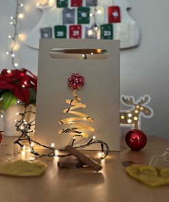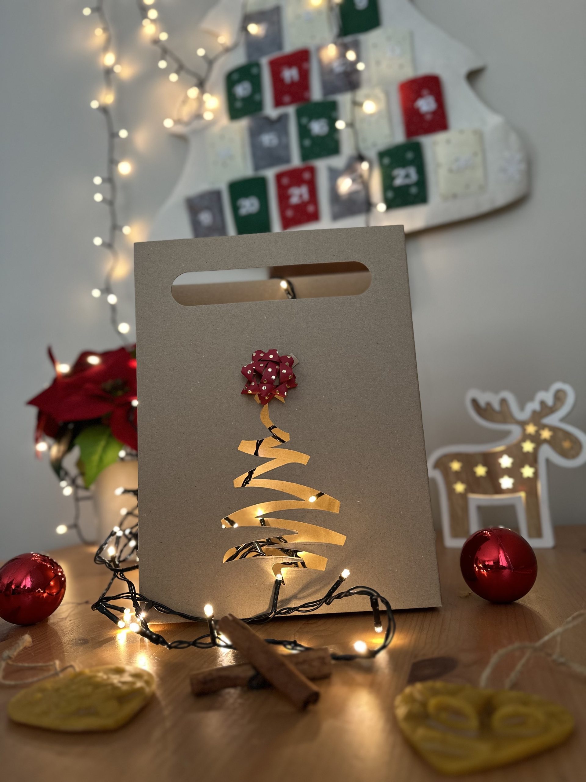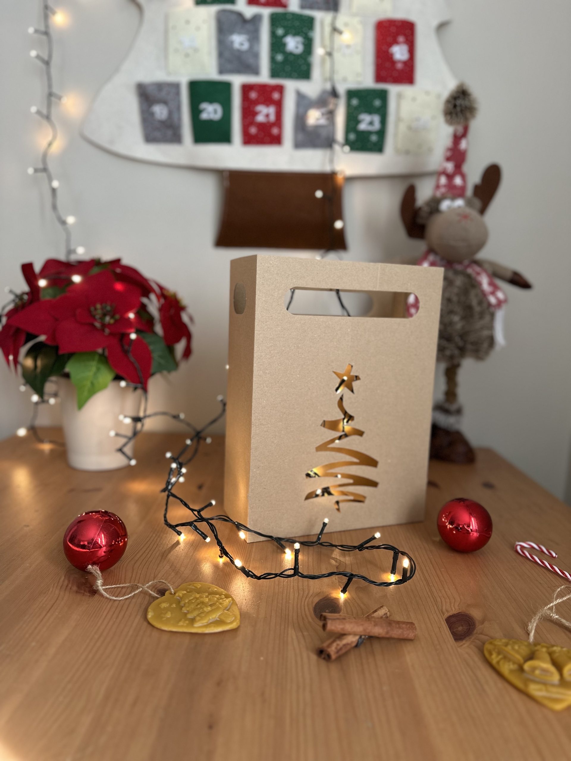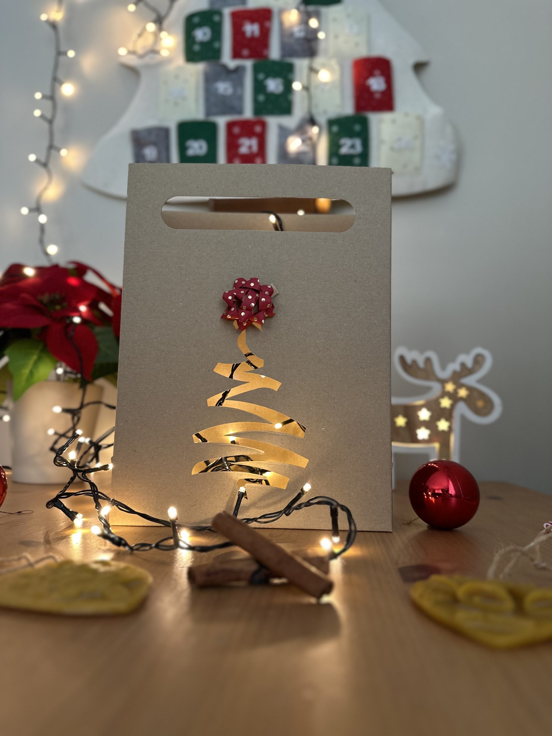 Ez az egyszerű, mégis hangulatos karácsonyfás ajándéktáska remek megoldás lehet családtagoknak, barátoknak, munkatársaknak szánt mézes meglepetésekhez.
